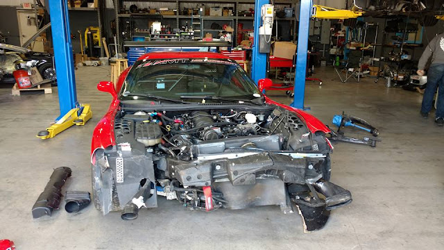 The damage was extensive. Unless you're a real Corvette nerd it would bore you to hear the list of parts needed, but you can get the idea from this picture. Thankfully motor and suspension parts were unharmed. Frame needs to be cut, straightened, and a new section welded in. Of course it would be silly to not make upgrades as long as the car is getting torn apart, so we're adding an AJ Hartman carbon fiber hood and leaning forward a new racing radiator and ducting the air out the hood for increased downforce and better cooling. While we're at it we have to flip the intake manifold and run the air intake into the cabin. So we might as well add a Fast 102 intake manifold as well as an LS2 throttle body and fuel rails to take advantage of the new ST2 rule allowing more horsepower next year. Yay racecars. We'll also make a new splitter but this time use 3/8" thick wood and wrap it in carbon fiber for stiffness and lightness. I'll be doing the carbon fiber work so I assure you it will not be pretty but it will be functional.